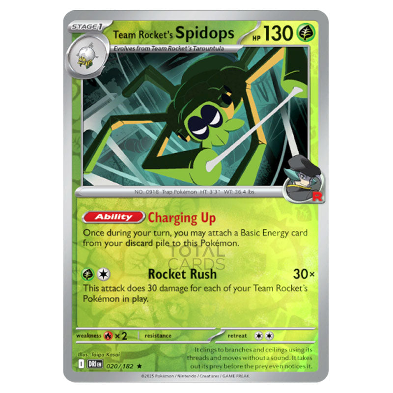 Team Rocket's Spidops is a Rare (Stage 1) Grass type Pokémon card from SV10 - Destined Rivals Reverse Holo (020/182)