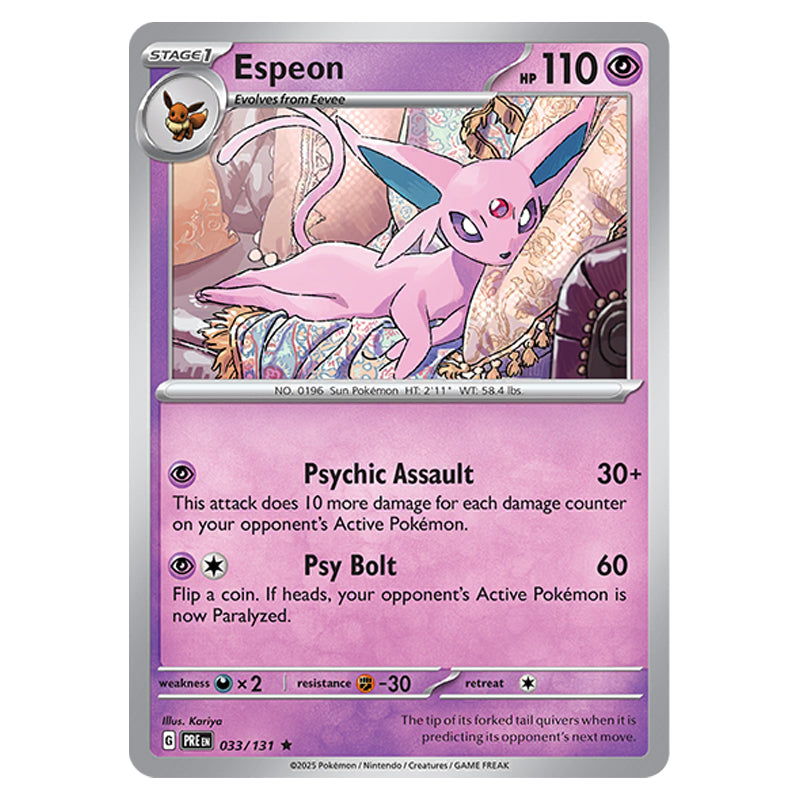 Espeon is a Rare (Stage 1) Psychic type Pokémon card from SV8.5 - Prismatic Evolutons (033/131)