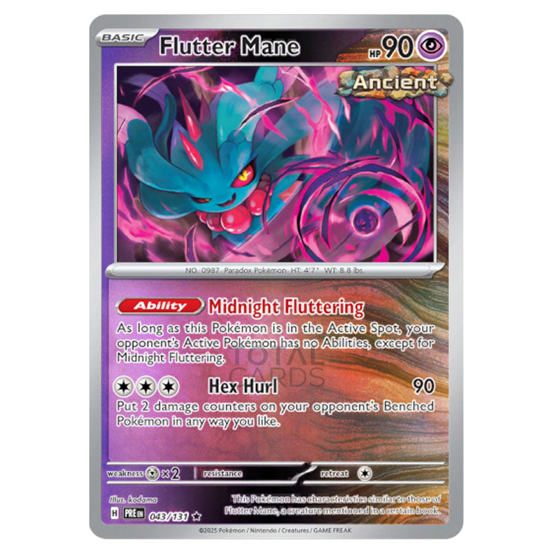Flutter Mane is a Rare (Basic) Psychic type Pokémon card from SV8.5 - Prismatic Evolutons Reverse Holo (043/131)