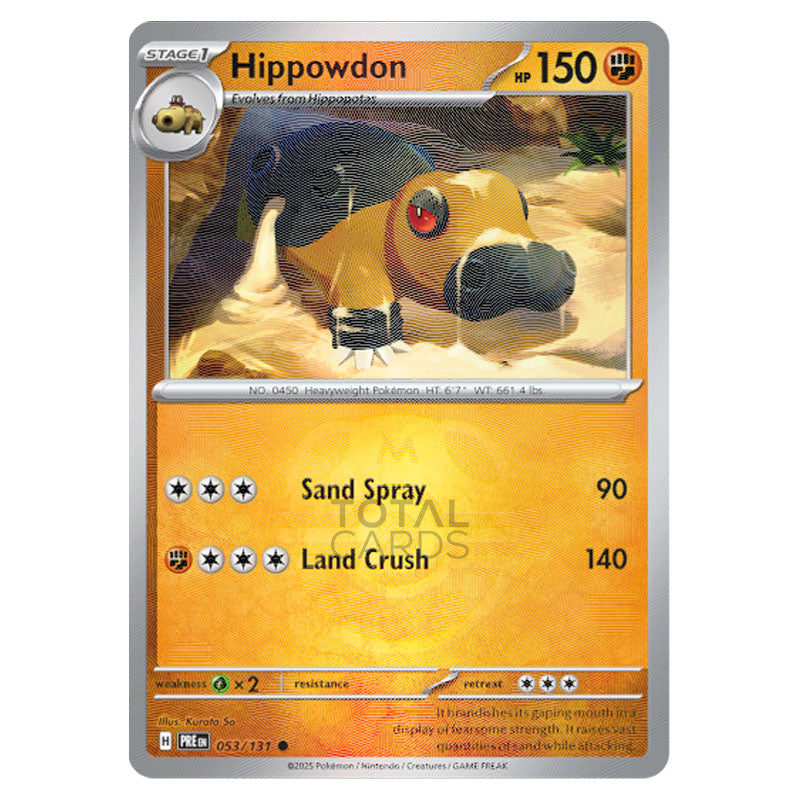 Hippowdon is a Common (Stage 1) Fighting type Pokémon card from SV8.5 - Prismatic Evolutons Reverse Holo Master Ball (053/131)