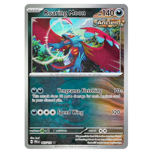 Roaring Moon is a Rare (Basic) Darkness type Pokémon card from SV8.5 - Prismatic Evolutons Reverse Holo Poke Ball (065/131)