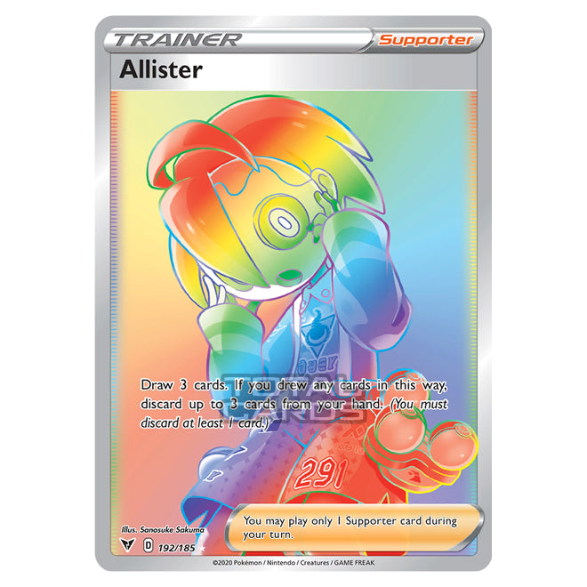 Allister is a Rainbow Rare, Full Art Supporter Trainer card from SWSH4 Vivid Voltage. (192/185)