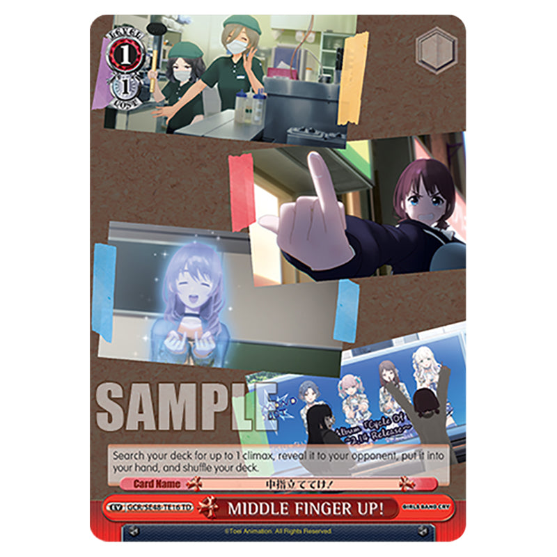 Event is a TD Red Event card from the Weiss Schwarz set Girls Band Cry (WSSC-GCR/SE48-TE16) Search your deck for up to 1 climax, reveal it to your opponent, put it into your hand, and shuffle your deck.