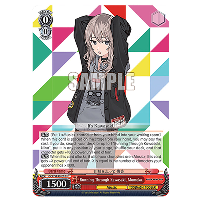 Running Through Kawasaki, Momoka is a N Red Character card from the Weiss Schwarz set Girls Band Cry (WSSC-GCR/SE48-E10) 【AUTO】 [Put 1 《Music》 character from your hand into your waiting room] When this card is placed on the stage from your hand, you may pay the cost. If you do, search your deck for up to 1 "Running Through Kawasaki, Nina", put it in any position of your stage, shuffle your deck, and that character gets +1000 power until end of turn.【AUTO】 When this card attacks, if all of your characters are 《Music》, this card gets +X power until end of turn. X is equal to the number of characters your opponent has ×1000.