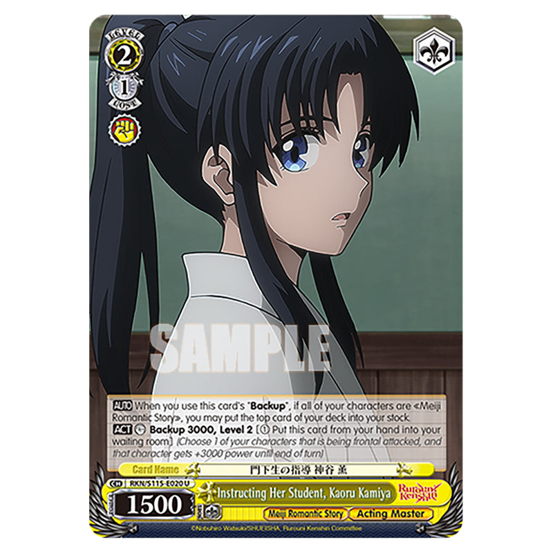 Instructing Her Student, Kaoru Kamiya is a U Yellow Character card from the Weiss Schwarz set Rurouni Kenshin (WSSC-RKN/S115-E020) 【AUTO】 When you use this card's "Backup", if all of your characters are 《Meiji Romantic Story》, you may put the top card of your deck into your stock. 【ACT】 【COUNTER】 Backup 3000, Level 2 [(1) Put this card from your hand into your waiting room] (Choose 1 of your characters that is being frontal attacked, and that character gets +3000 power until end of turn)