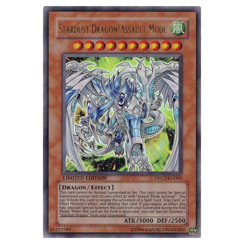 Cannot be Normal Summoned/Set. Must first be Special Summoned with \"Assault Mode Activate\" and cannot be Special Summoned by other ways except by its own effect. When a card or effect is activated (Quick Effect): You can Tribute this card; negate the activation, and if you do, destroy it. During the End Phase, if this effect was activated this turn (and was not negated): You can Special Summon this card from your GY. When this card on the field is destroyed: You can target 1 \"Stardust Dragon\" in your GY; Special Summon that target.