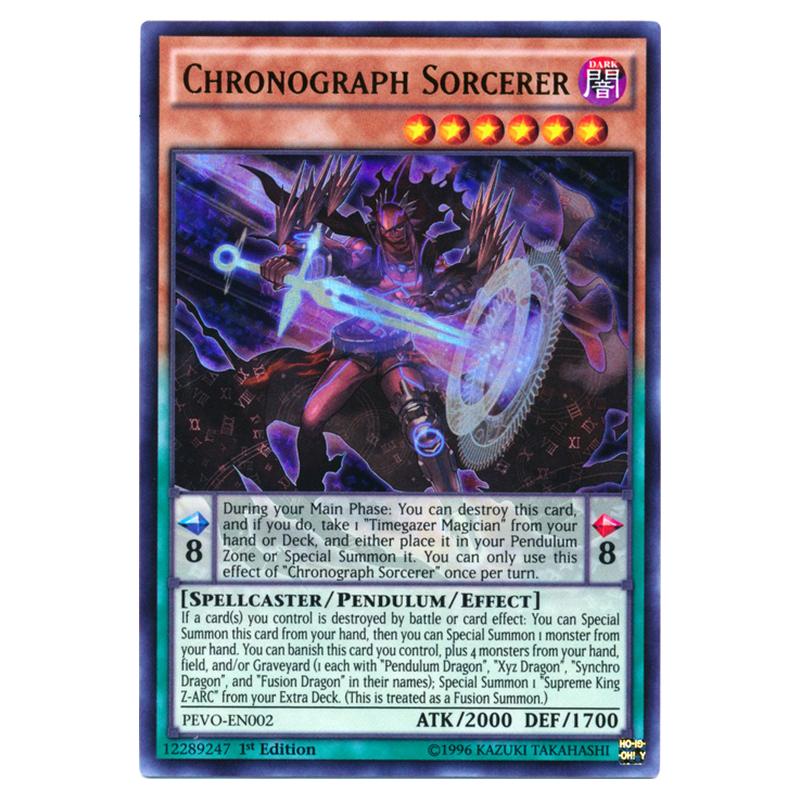 [ Pendulum Effect ] During your Main Phase: You can destroy this card, and if you do, take 1 "Timegazer Magician" from your hand or Deck, and either place it in your Pendulum Zone or Special Summon it. You can only use this effect of "Chronograph Sorcerer" once per turn.[ Monster Effect ] If a card(s) you control is destroyed by battle or card effect: You can Special Summon this card from your hand, then you can Special Summon 1 monster from your hand. You can banish this card you control, plus 4 monsters from your hand, field, and/or GY (1 each with "Pendulum Dragon", "Xyz Dragon", "Synchro Dragon", and "Fusion Dragon" in their names); Special Summon 1 "Supreme King Z-ARC" from your Extra Deck. (This is treated as a Fusion Summon.)