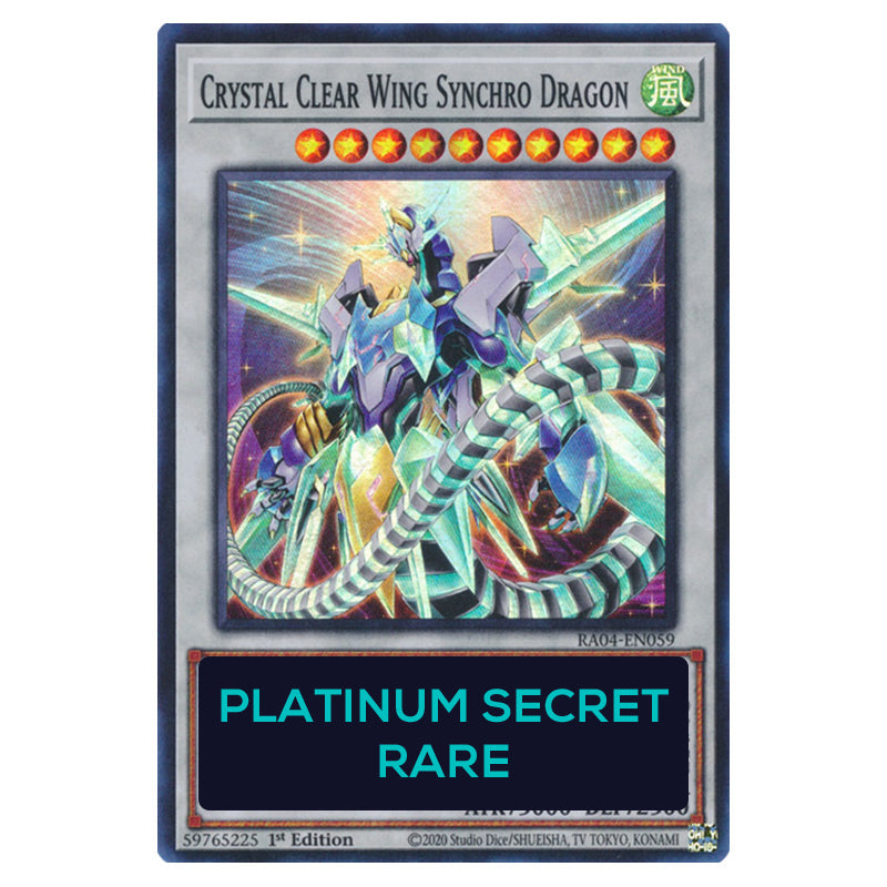 Crystal Clear Wing Synchro Dragon is a Platinum Secret Rare, Effect Synchro Monster from the Yugioh set Quarter Century Stampede (RA04-EN059-PSR)